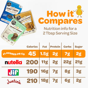 Traditional nut butters are filled with natural oil that is loaded with calories. We press the oil out of the peanuts, roast them, and grind it into a powder to remove all the fat and calories.