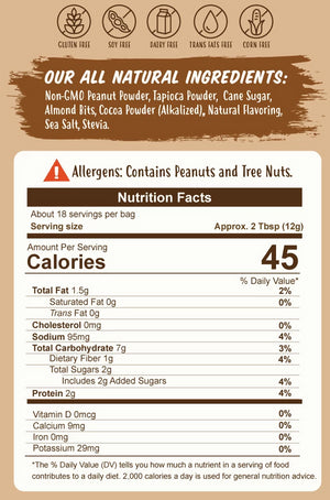 Non-GMO Peanut Powder, Tapioca Powder, Cane Sugar, Almond Bits, Cocoa Powder, Natural Flavoring, Sea Salt, Stevia.